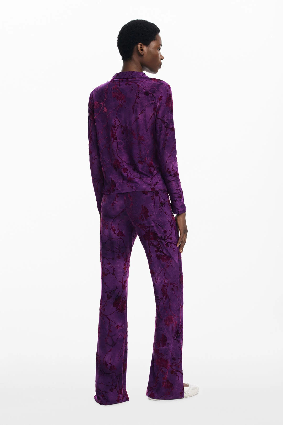 Long-sleeve textured T-shirt with front buttoning and oriental-inspired floral print in purple tones.