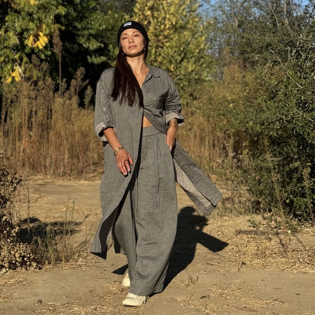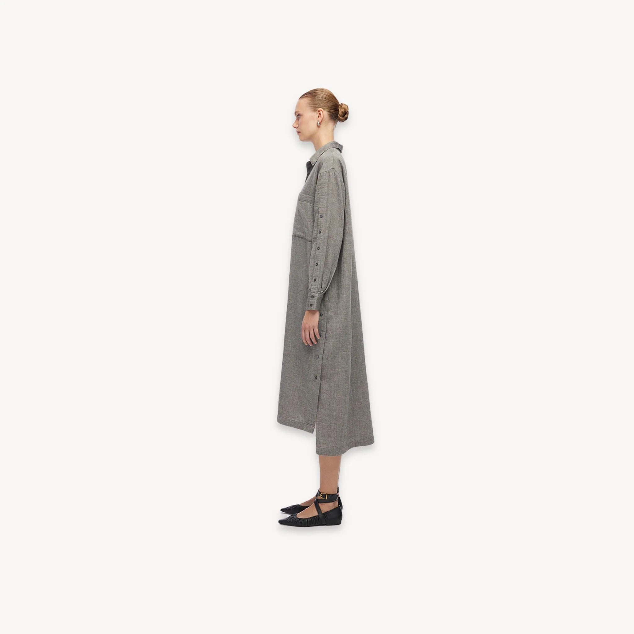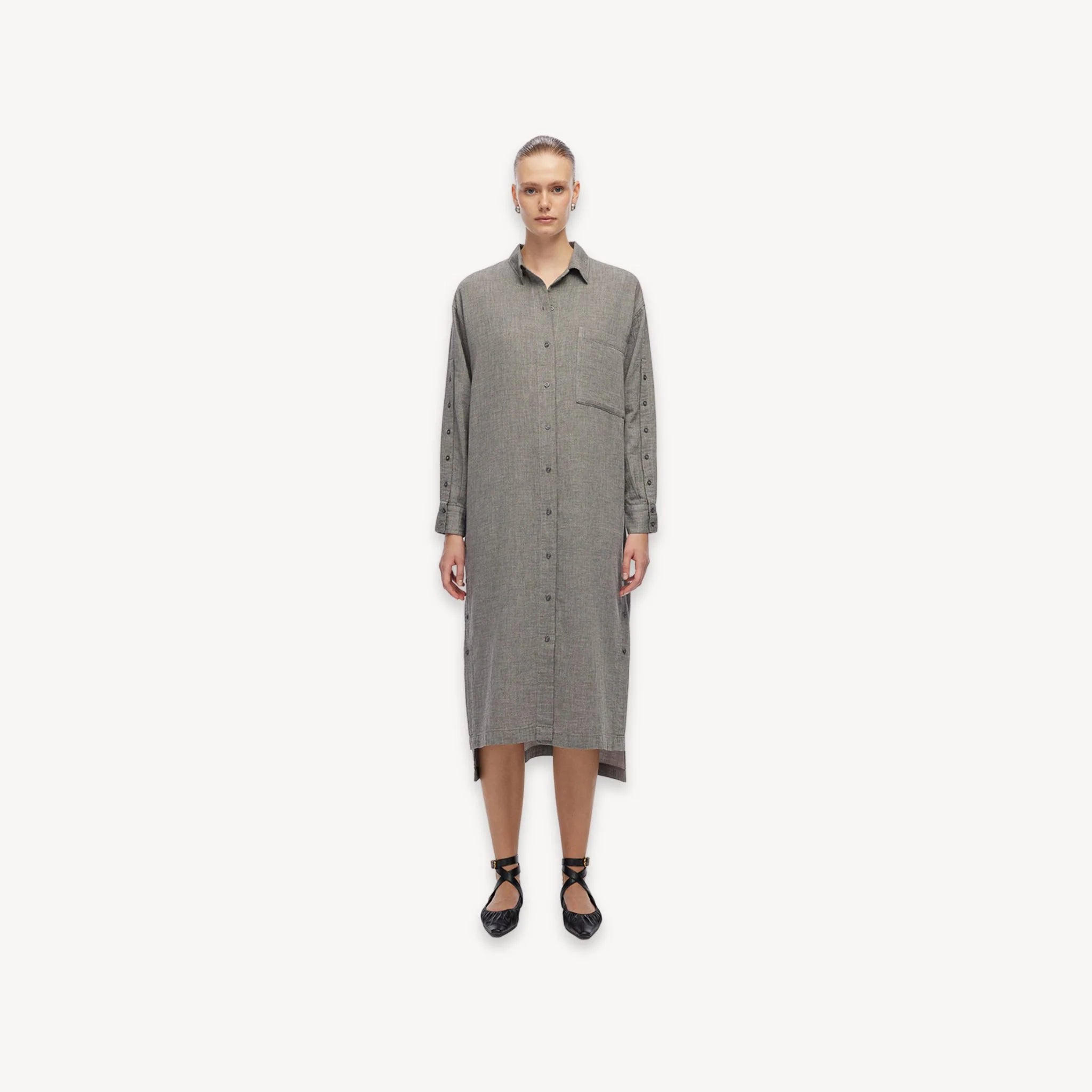 Combine work wear & lounge with the Buttoned Shirt Dress. Designed sustainably as a year-round capsule closet dress to pair with everyday, every-situation outfits.