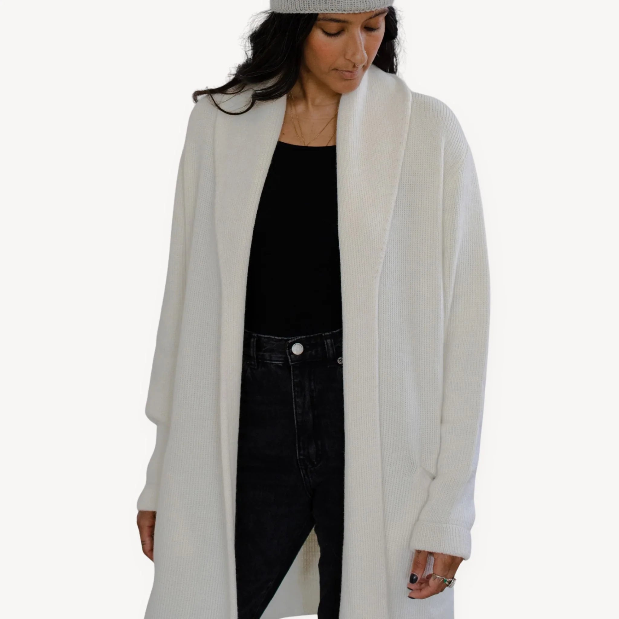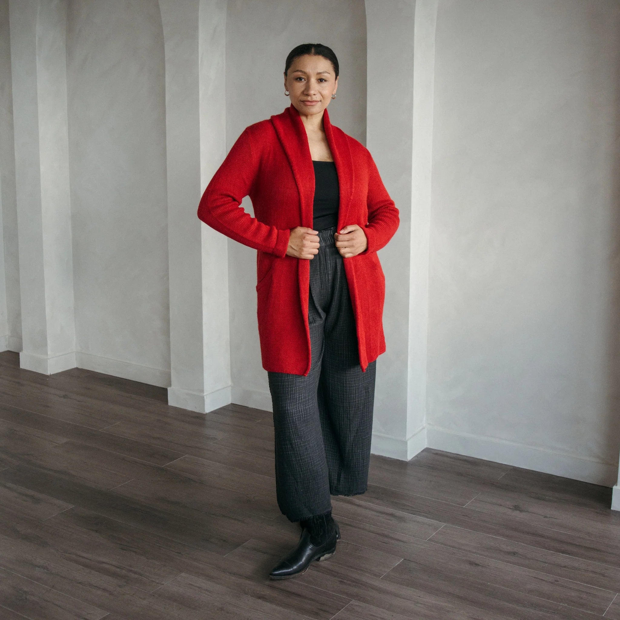 With deep open pockets and rounded shoulders, the Mia Sweater has a versatile style infused with the Peruvian textile artistry. Alpaca has a stretchy, silky nature to it, so this one-size alpaca style is able to fit many different types of bodies. We’ve gone a medium length, with a complementary backline; this doubles as a Fall, transition coat, and a year-round sweater.